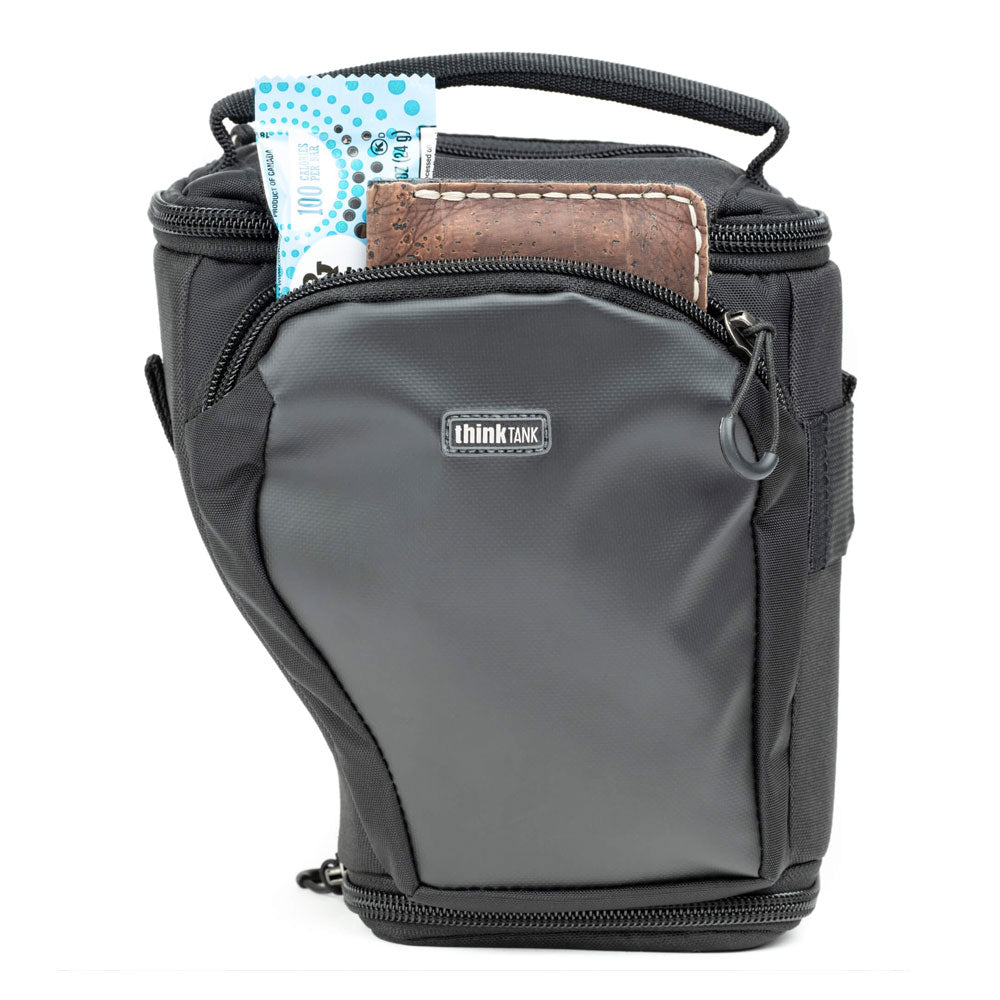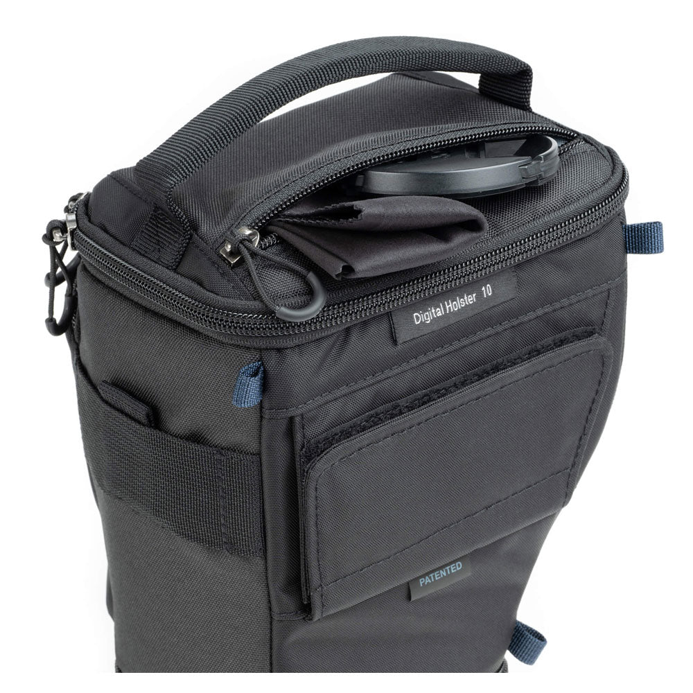 The Thinktank Digital Holster 10 v3 is a unique holster developed specifically for a larger compact body with a 24-70mm f/4 attached with the hood reversed. Popped-down, it fits a 24-70mm f/2.8 with its lens hood reversed.