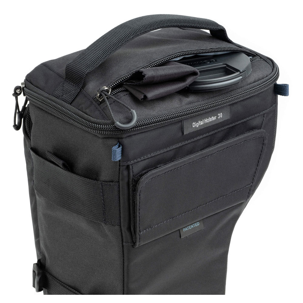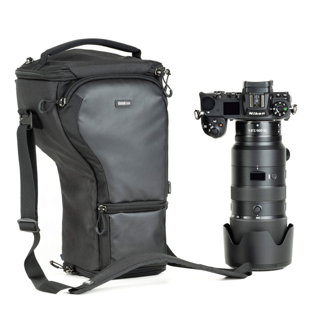 The Thinktank Digital Holster 30 v3 is a unique holster developed specifically for a standard-size camera body with a 70-200mm f/2.8 attached with its hood reversed. Popped-down, it fits a 70-200mm f/2.8 with the hood in shooting position.