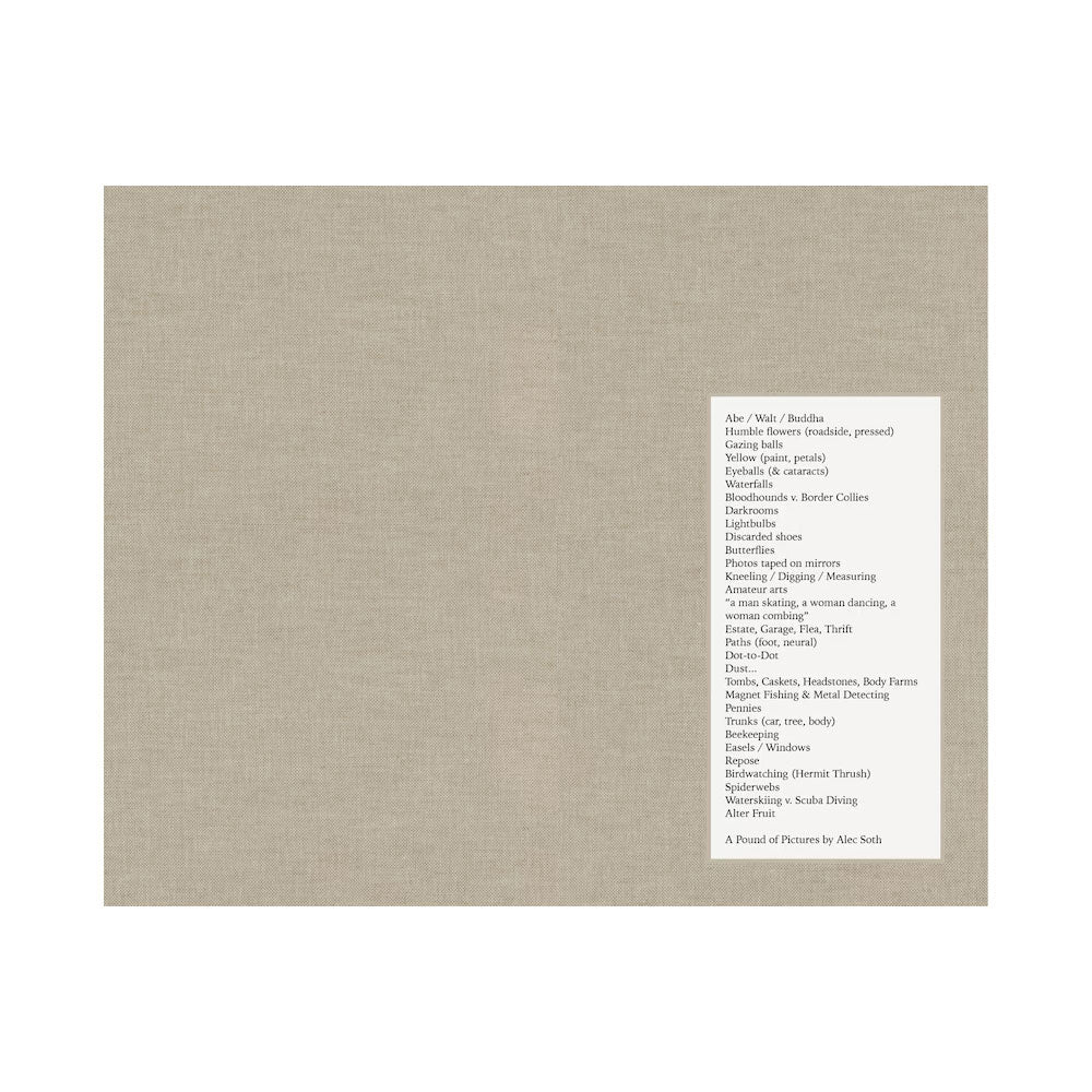 A Pound of Pictures is a stream-of-consciousness celebration of the photographic medium, bringing together an entirely new collection of work by Alec Soth made between 2018 and 2021. Depicting a sprawling array of subjects ― from Buddhist statues and birdwatchers to sun-seekers and busts of Abe Lincoln ― this book reflects on the photographic desire to pin down and crystallize experience, especially as it is represented and recollected by printed images. Throughout this eclectic sequence are the recurring presences of iconography, of souvenirs and mementos, and of the image-makers that surround us day to day. Forming a winding, ruminative road trip, Soth’s photographs are followed by his own notes and reflections in an extended afterword. ‘If the pictures in this book are about anything other than their shimmering surfaces,’ he writes, ‘they are about the process of their own making. They are about going into the ecstatically specific world and creating a connection between the ephemeral (light, time) and the physical (eyeballs, film).’ Each book contains five randomized replica vernacular photographs loosely inserted within the pages.