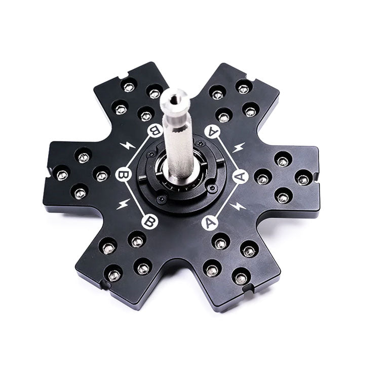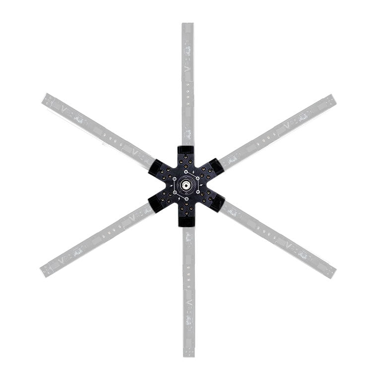 The Aputure INFINIBAR 6-Way Flat Connector is an all-metal connector for your INFINIBAR lights, with DC power passthrough for connected lights and a baby pin at the centre of the connector for rigging on to stands and other baby pin receivers. Each INFINIBAR light is safely secured to the connector with captive 5mm hex screws.