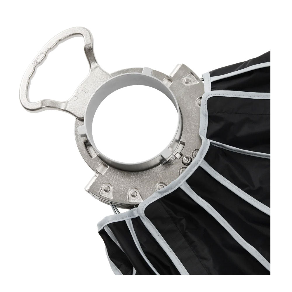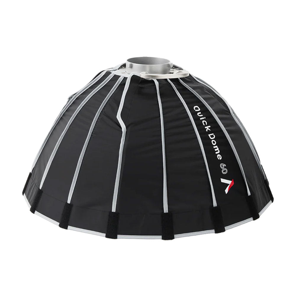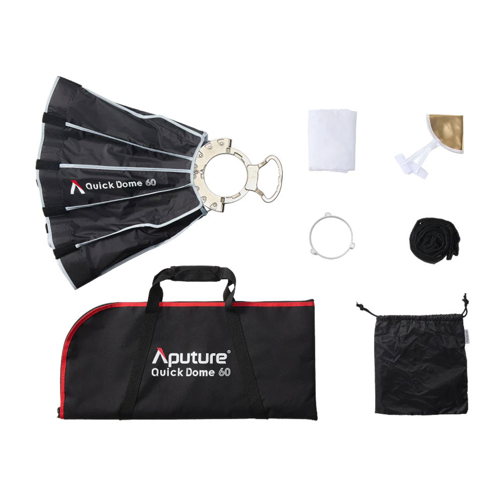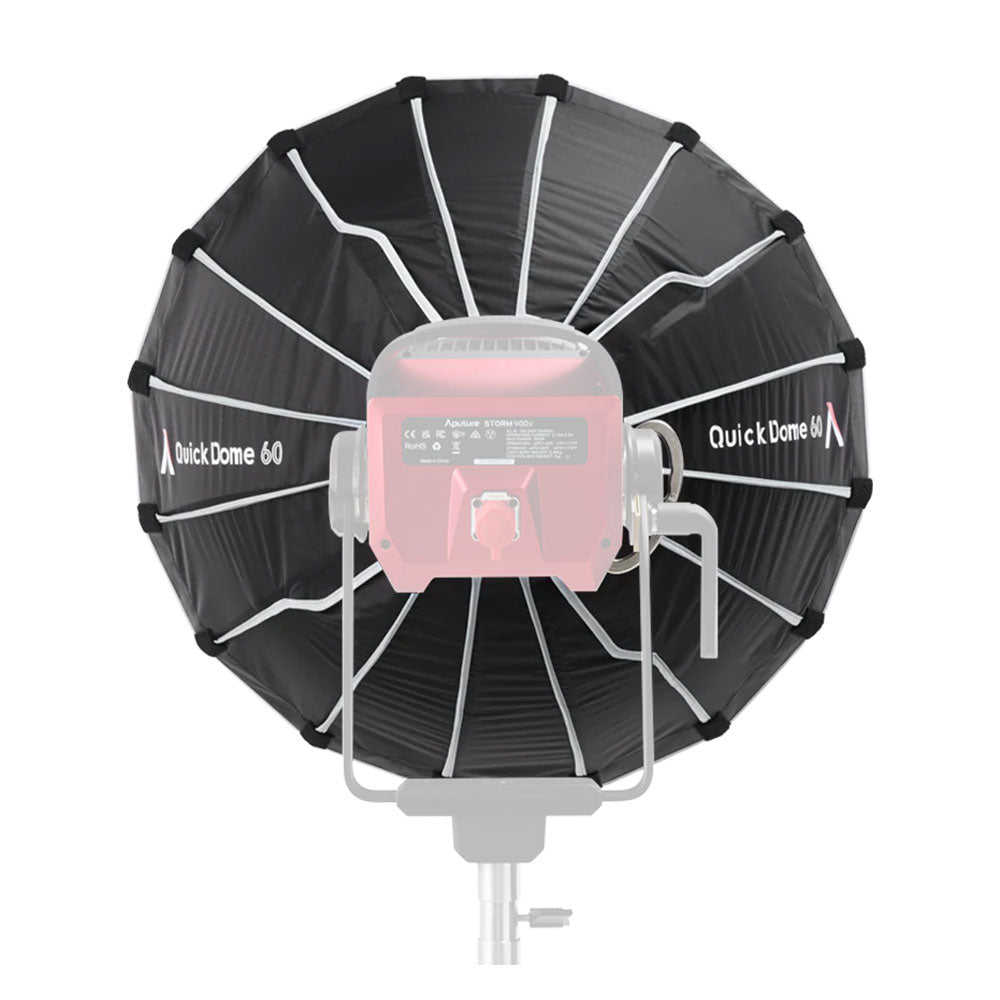 The Aputure Quick Dome 60 is a 60cm (2ft) circular Bowens mount softbox built for fast, reliable light shaping on set. Its quick release latch mechanism allows users to tension the steel support rods on the speed ring within seconds, streamlining both setup and teardown. The extended lateral side handle makes mounting and unmounting easy and controllable, and Quick Dome 60 packs flat for storage and transport. Includes 1-stop diffusion, inner baffle, and 40° light control grid.