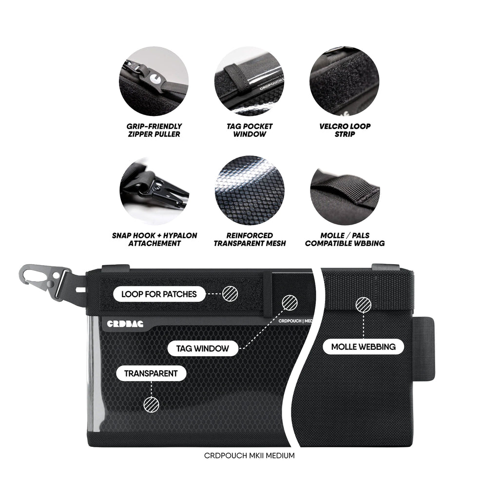 Clear mesh window with crease-proof 0.8mil TPU. Velcro panel on the front and hypalon side label for custom stitching. MOLLE/PALS-compatible webbing on the back for diverse attachment possibilities.