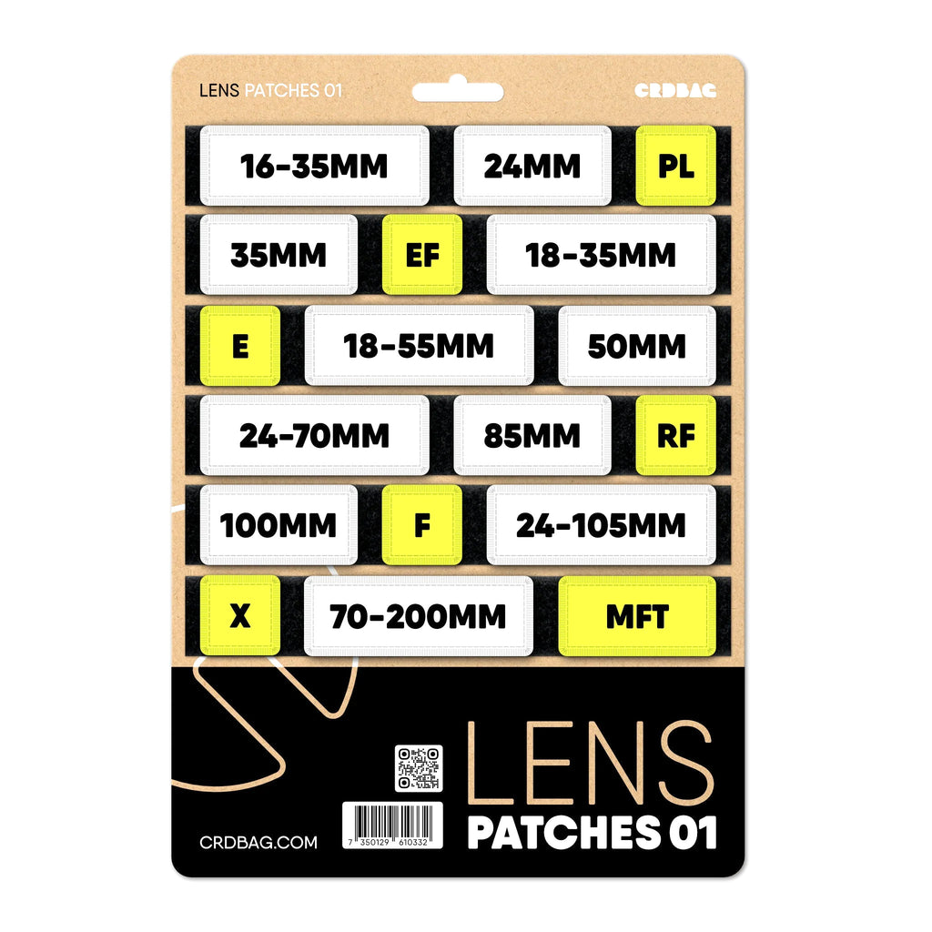 The CRDBAG Lens Patches 01 is a set of 18 lens-focused Velcro hook patches, thoughtfully crafted for use with the CRDPOUCH MKII, Fused Mini, Brick, and Y-Wrap, ensuring seamless compatibility with your gear. It includes 11 Embroidered Lens Patches, and 7 Yellow Mount Patches.