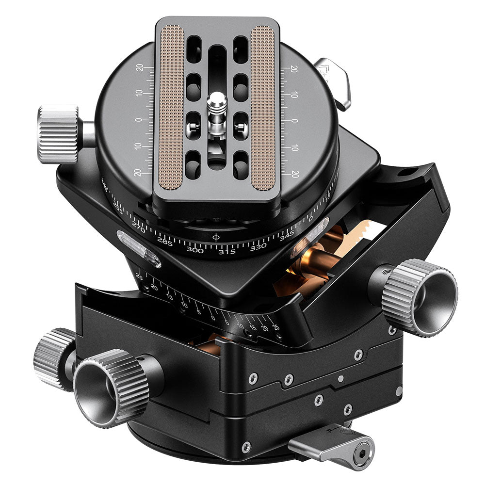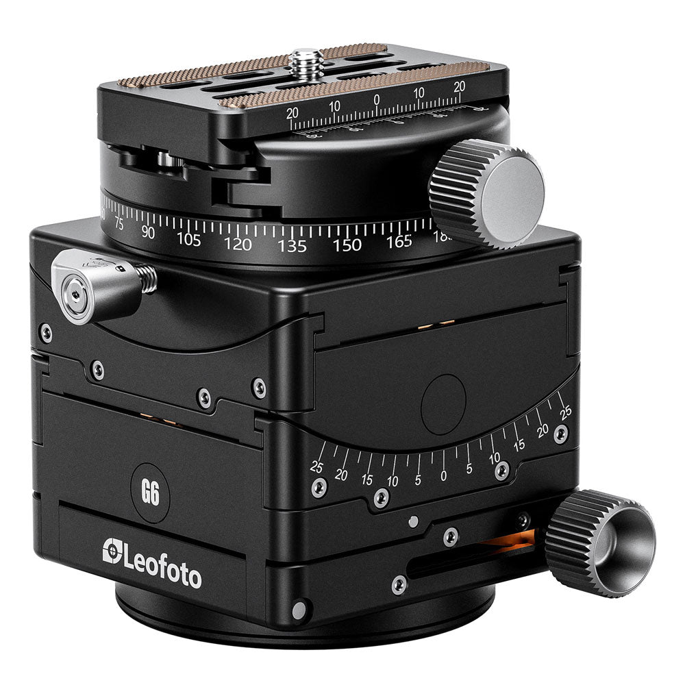 The Leofoto G6 provides pitch (perspective) and roll (leveling) adjustment via the use of a high-precision gear design that allows for hyper-accurate composition often required by architectural and product macro photographers. The horizontal, tilt, and vertical axes are controlled independently, with mechanisms below the camera, allowing you to search for the best level before taking pictures. Some photographers use them as inseperable micron motion patella to appreciate their compactness and the extreme accuracy of micro motion, especially in architecture and studios.
