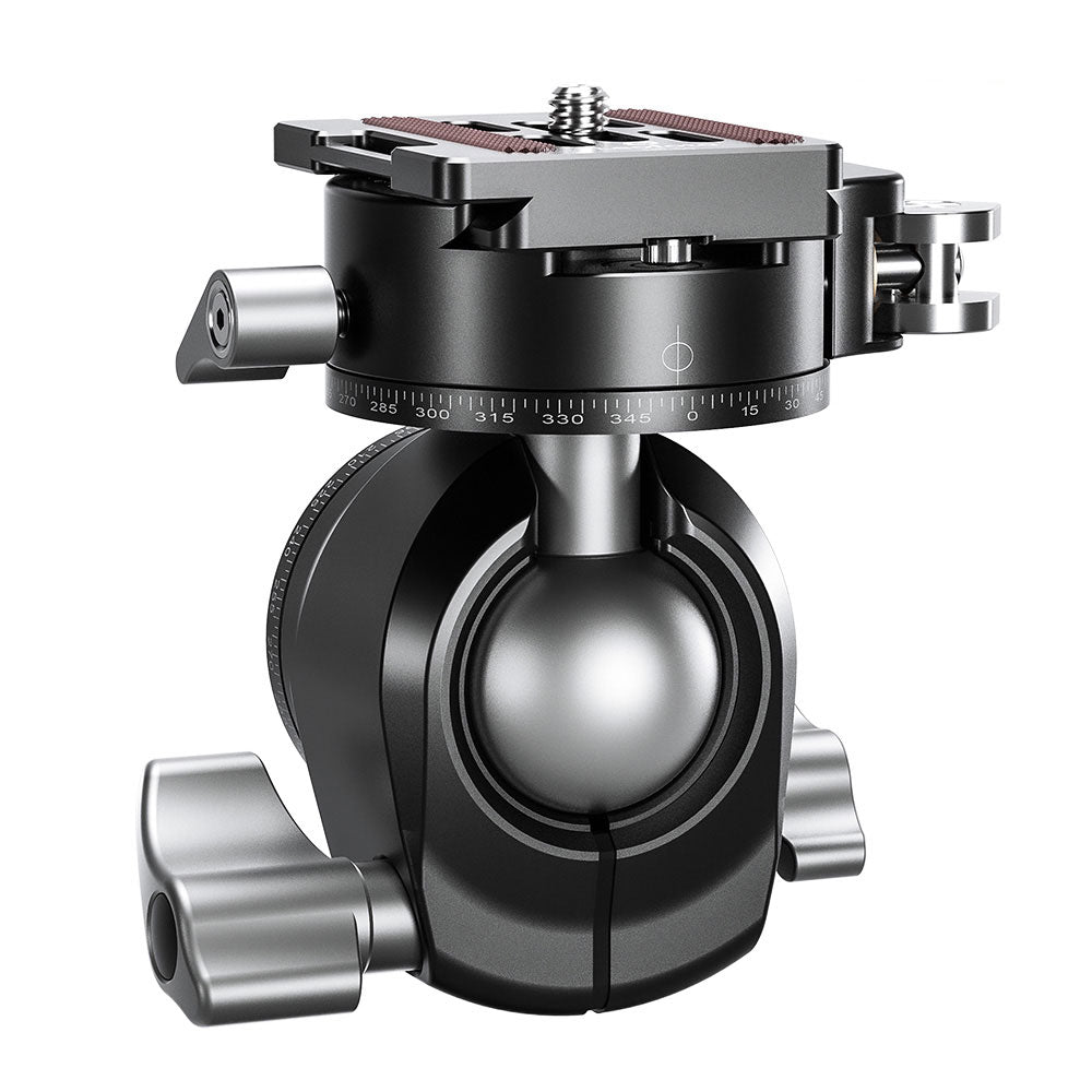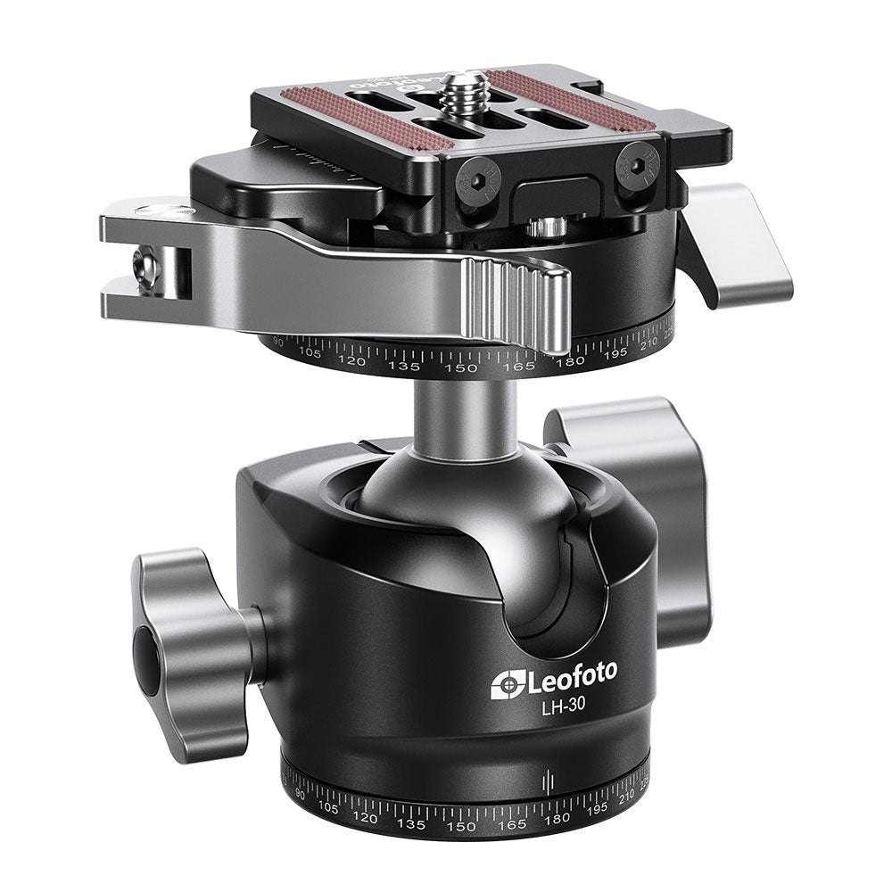 The Leofoto LH-30PCL is a professional-grade ball head designed to support heavy payloads while locking solidly and moving smoothly. The large, ergonomic main locking knob is easy to handle, and the precisely-machined ball is silky smooth. Dual drop notches allow you to easily change from landscape mode to portrait mode or other angles. A laser-engraved scale on the panning base provides easy and precise control during panorama shooting.
