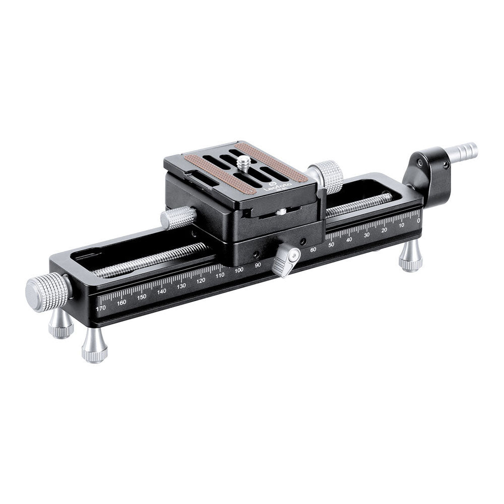 The Leofoto MP-180S macro focusing rail features a 17cm travel distance and a precision linear motion lead screw, incorporating a camera platform with a rotating Arca-compatible quick release plate. Each full rotation of the crank provides 1.25mm of movement for precise camera positioning, and the crank handle folds flat for convenient storage.