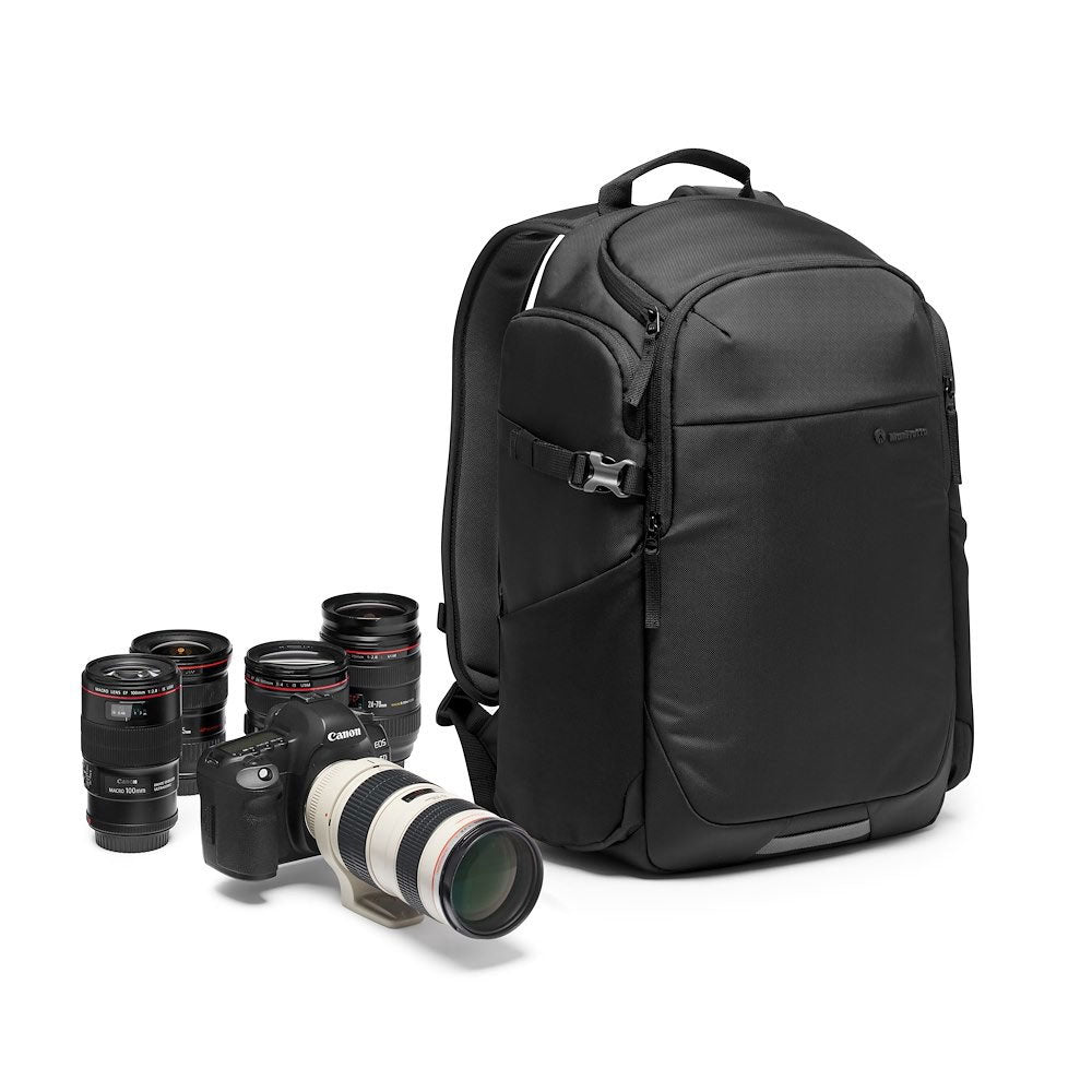 The Manfrotto Advanced Befree backpack III is big enough for a large DSLR kit, devices and personal belongings. The lower compartment with a rear opening, holds DSLR camera such as Canon 5D Mark IV with a 70/200 mm f/2.8 lens attached and up to 6 additional lenses.