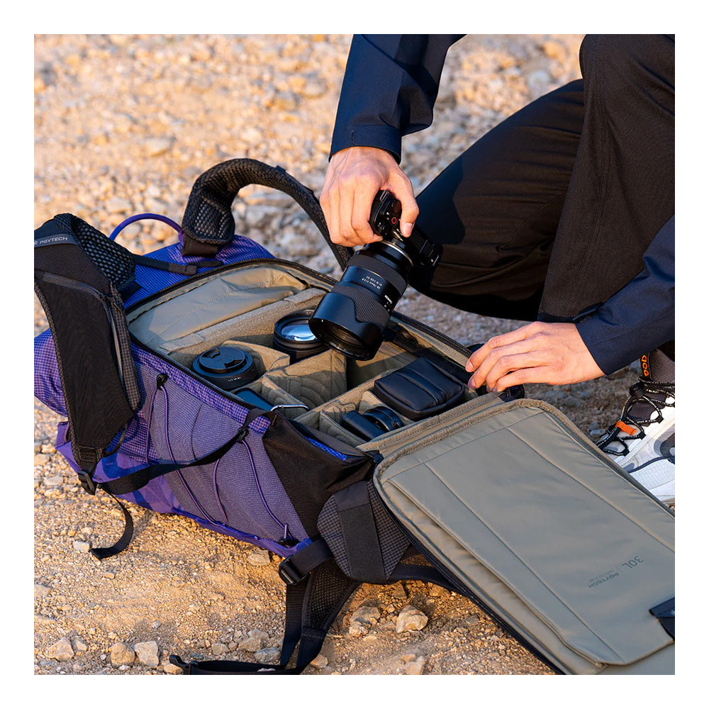 Main compartment opens fully for easy packing. The customizable dividers can be reconfigured or removed. The inner compartment features a fixed structure that snugly contours the pack's interior, preventing gear from shifting during movement. This ensures a balanced centre of gravity, and it can easily be removed when not in use.