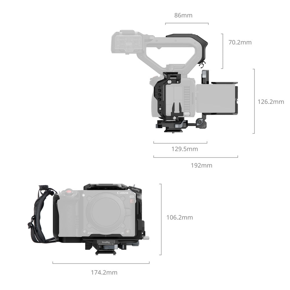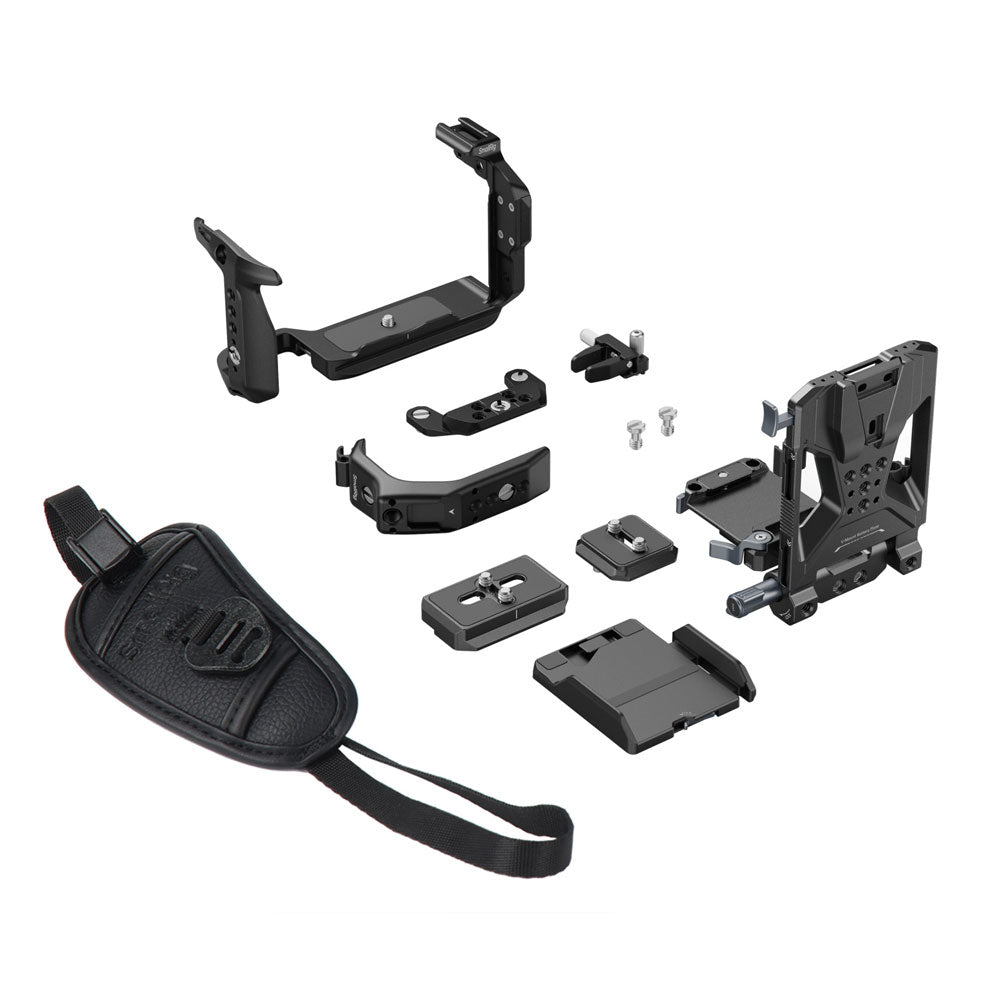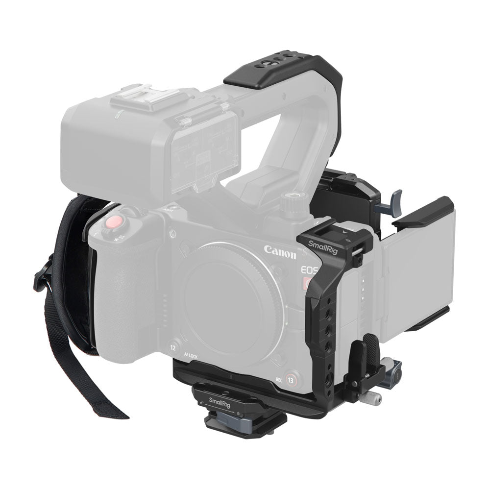 This SmallRig Advanced Cage Kit for the Canon EOS C50 safeguards your camera while seamlessly integrating V-mount batteries for extended, uninterrupted power, and includes a wrist strap for enhances stability and comfort during handheld shooting. The XLR handle extension rig piece provides additional mounting points for easy attachment of professional gear, alongside a multitude of expansion options for a completely customizable setup. The dedicated cable clamps ensuring uninterrupted data transmission.