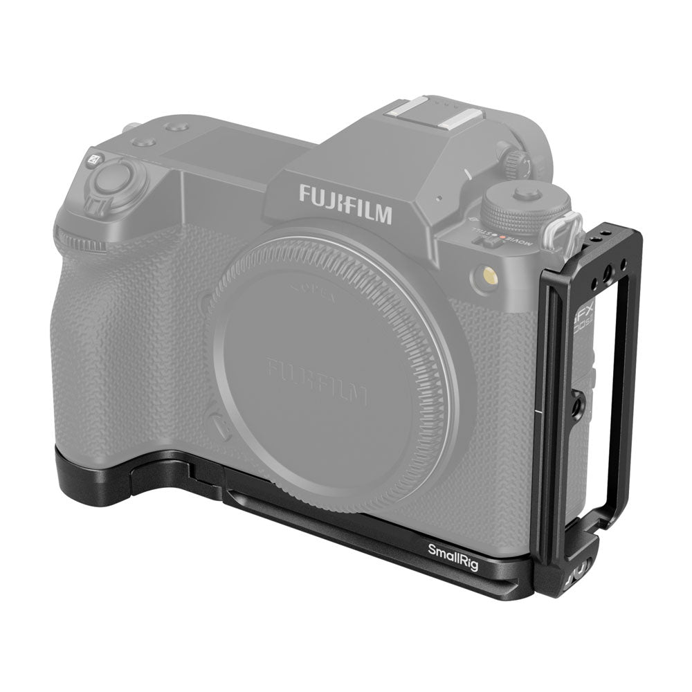 The SmallRig L-Shape Mount Plate for FUJIFILM GDX100S II allows swift switching between landscape and portrait modes with arca-compatible quick-release plates on the bottom and side of the mount plate. The three-point locking system prevents twisting, securing the camera with a 1/4"-20 screw, roll pin, and a locating block that maintains stability in portrait mode. The side plate also extends for easy cable management.