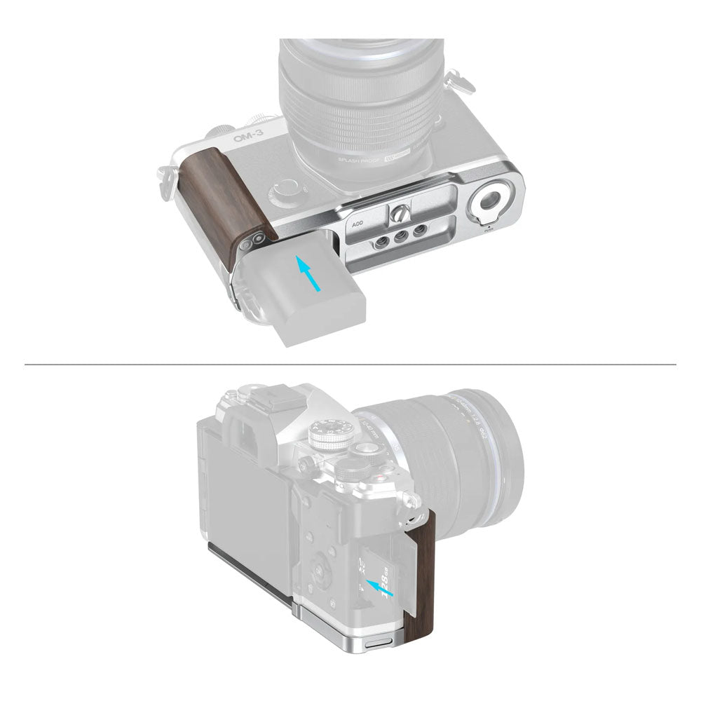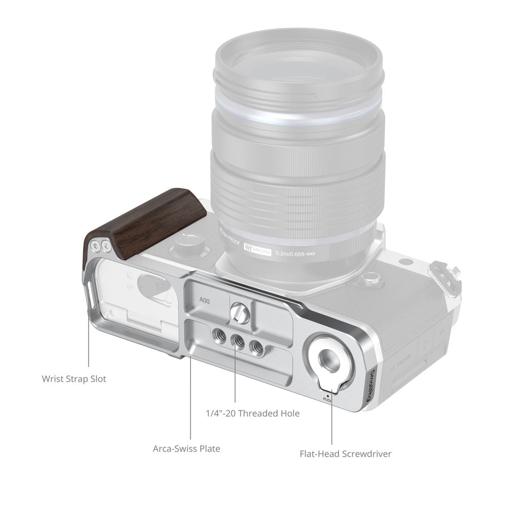 The SmallRig L-Shaped Mount Plate with Wooden Handle for OM SYSTEM OM-3 5563 is expertly designed to enhance both the aesthetics and control of your camera. It attaches securely with a 1/4"-20 screw and features built-in silicone pads to prevent scratches.